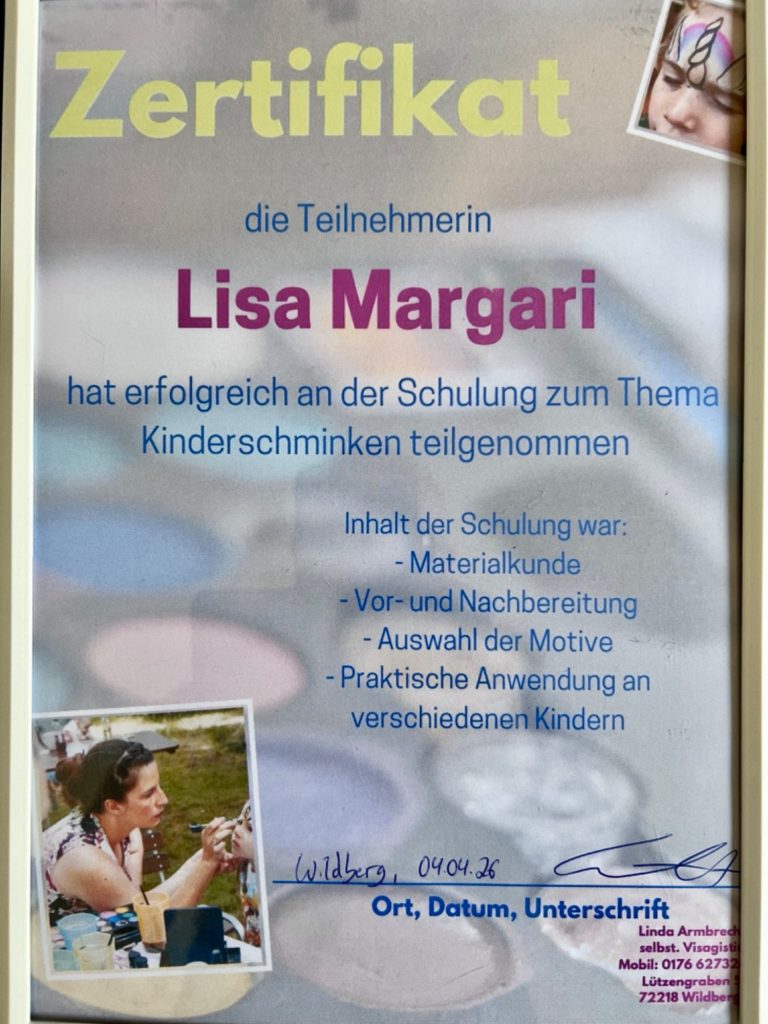 Bei mir steht die Sicherheit der Kinder an erster Stelle. Ich verwende ausschließlich hochwertige und hautfreundliche Schminkfarben, die leicht mit Wasser und Seife abwaschbar sind. Utensilien werden regelmäßig gereinigt und erneuert!